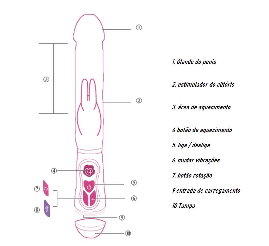 Recomendações: Por tratar-se de um produto erótico de uso íntimo recomenda-se a higienização do produto antes e após o uso, além do uso de lubrificante e preservativo. Lavar com água e sabão neutro antes e após o uso e não compartilhar. Conservar fora da luz solar e não expor a temperatura superior a 50ºC.